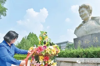 2017年8月16日,在山东省淄博市博山区焦裕禄纪念馆,焦裕禄的女儿焦守云向焦裕禄雕像敬献花篮。新华社记者 郭绪雷 摄 焦裕禄,一个依旧滚烫的名字。