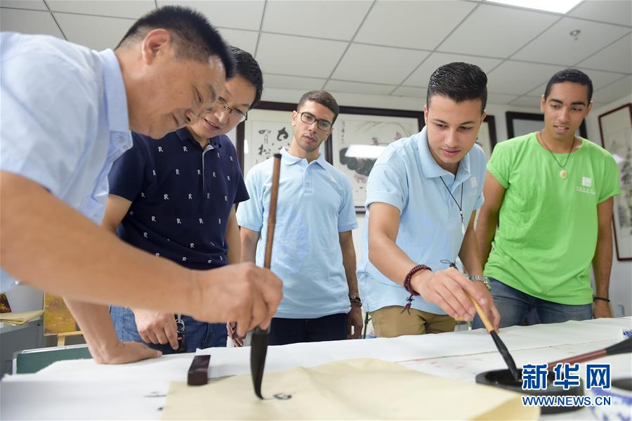 来自埃及开罗海外中国文化中心的优秀学员在学习书法。