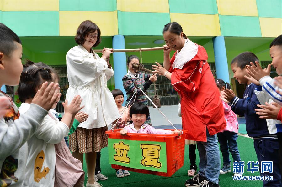 5月4日,湖北省保康县一家幼儿园老师用传统方法给孩子称体重。新华社发(杨韬 摄)