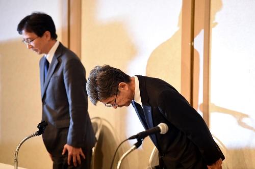 2017年10月20日,在日本东京,日本神户制钢所(神钢)副社长梅原尚人(右)就其下属子公司篡改产品数据问题鞠躬致歉。新华社记者马平摄