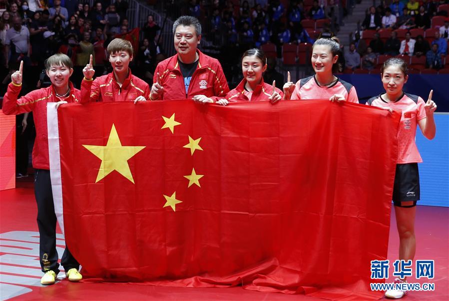 5月5日,中国队队员和教练李隼(左三)赛后庆祝夺冠。当日,在瑞典哈尔姆斯塔德举行的2018年乒乓球世界团体锦标赛女团决赛中,中国队以3比1战胜日本队,夺得冠军。新华社记者 叶平凡 摄