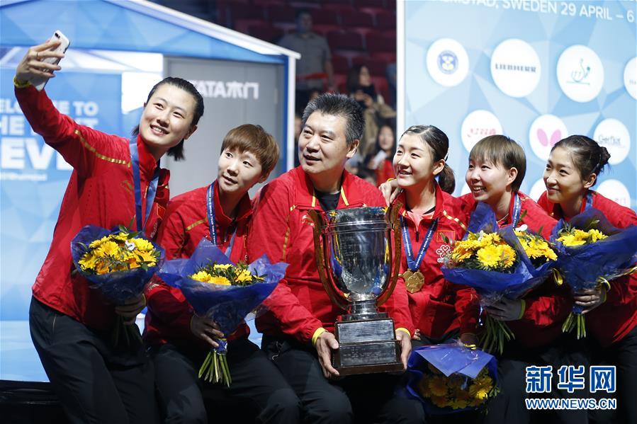 5月5日,中国队队员和教练李隼(左三)在颁奖仪式上自拍庆祝。当日,在瑞典哈尔姆斯塔德举行的2018年乒乓球世界团体锦标赛女团决赛中,中国队以3比1战胜日本队,夺得冠军。新华社记者 叶平凡 摄
