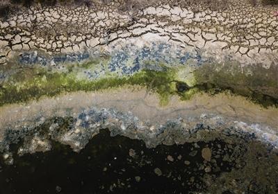 图为2018年3月30日在江苏连云港燕尾港镇化工园区内拍摄的一处水塘,离海一堤之隔的池塘水和岸滩“五颜六色”。记者 李响 摄