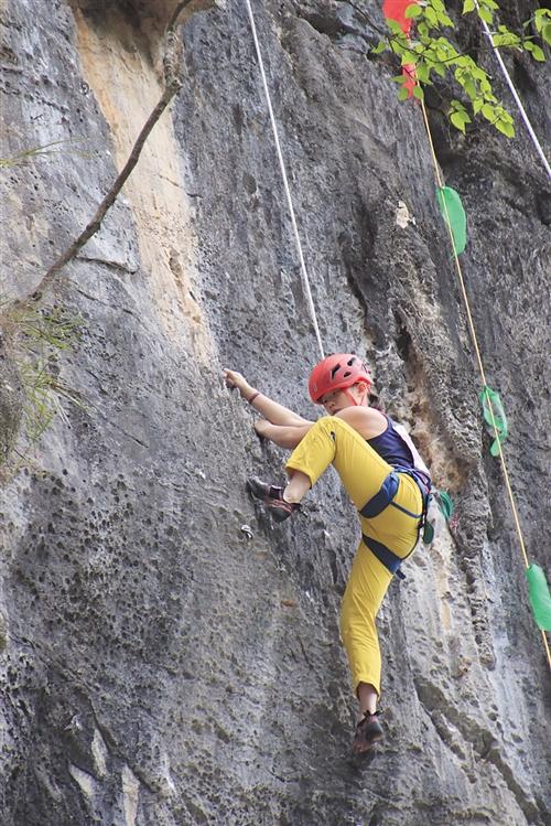 在当天的比赛中,各地顶尖选手纷纷亮相,富有技巧性、冒险性的比赛让观众目不暇接,被选手在高空中的优美身姿所折服,不时爆发出热烈的掌声。在这118名参赛选手里,年龄最小的是来自北京的12岁女孩骆知鹭,在女子组部分选手都没能在规定时间内完成攀爬到40米高度的情况下,她以5.68分的成绩登顶,获得了女子组第三的好成绩,这也是她第一次攀爬自然岩壁。“第一次参加自然岩壁的比赛,有些地方小沟沟特别难抓,但还是上去了,到马山参加攀岩比赛非常开心。”腼腆的骆知鹭说。