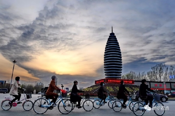 市民在河北雄安新区容城县县城道路上骑行(3月29日摄)。新华社记者牟宇 摄