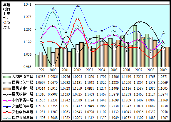 坐标:年度增长指数,上年人均值=1,小于1为负增长。柱形:产值、居民收入、总消费,高低比较可见历年增长同步性;曲线:居民积蓄与非物消费及其中交通通信、文教娱乐、医疗保健消费历年增长形成负相关关系,曲线呈现横向镜面对应俗称水中倒影。展示历年增长相关性需取连续性年度,数据库自动筛选最典型10年时间段,后台演算回溯20年取1996~2016年增长动向。相关系数取值1至-1之间,1具有全同步性,0不具相关性,-1具有全逆反性。