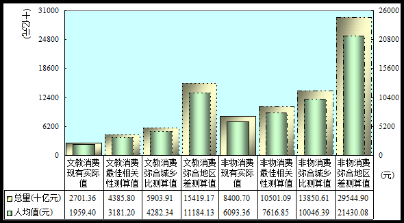 3.弥合地区差测算:基于弥合城乡比再假定全国各地间之间文教娱乐消费、非物生活消费单项人均值分别持平──(1)取东部城镇平均值,全国文教娱乐消费人均值应达到5595.76元,总量应达到77146.73亿元,为现有值2.86倍;非物生活消费人均值应达到13461.81元,总量应达到185593.22亿元,为现有值2.21倍。(2)取北京城镇值,全国文教娱乐消费人均值应达到11184.13元,总量应达到154191.68亿元,为现有值5.71倍;非物生活消费人均值应达到21430.08元,总量应达到295448.97亿元,为现有值3.52倍。