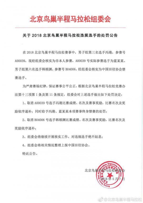 组委会在公告中称,在2018北京鸟巢半程马拉松赛事中,男子组第三名选手冯港,参赛号A00039,经组委会核实为非本人参赛,实际参赛选手为蓝某某;男子组第六名选手韩顺渊,经组委会核实为中国田径协会禁赛选手。