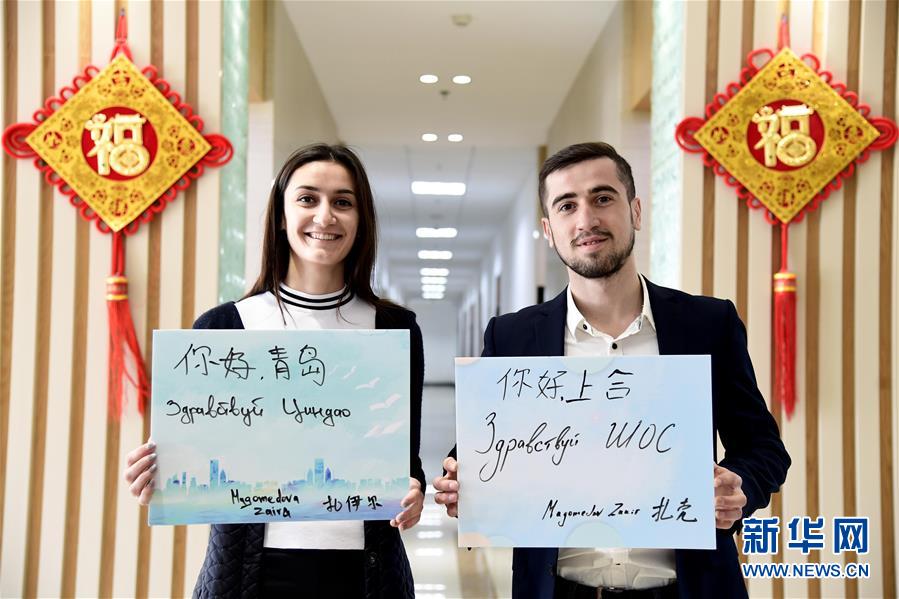 在位于青岛的中国石油大学(华东)学习的俄罗斯留学生扎克(右)和扎伊尔兄妹俩用汉语和母语写下“你好,上合”“你好,青岛”(5月3日摄)。新华社记者郭绪雷 摄