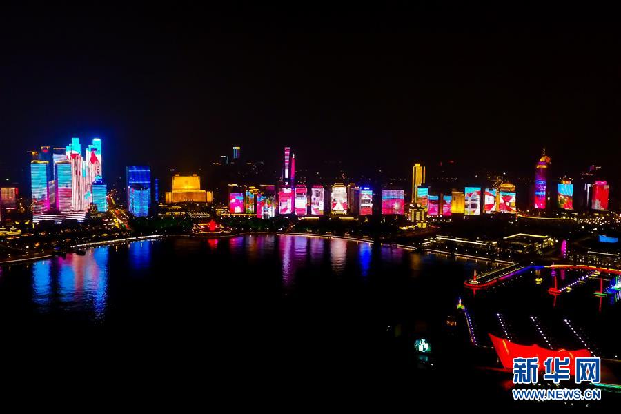 这是青岛浮山湾展现青岛风光的主题灯光秀(5月7日无人机拍摄)。新华社记者 李紫恒 摄