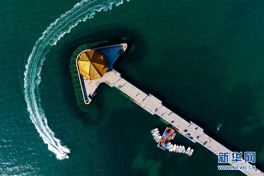 一艘游艇驶过青岛栈桥旁的海面(5月4日无人机拍摄)。新华社记者郭绪雷 摄