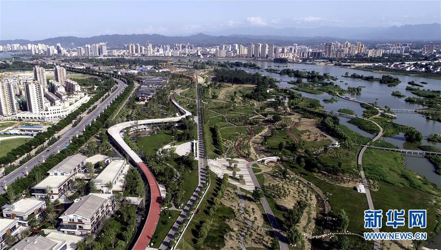 青山绿水气象新这是汉中市区一江两岸旁的汉江湿地公园(5月7日无人机拍摄)。