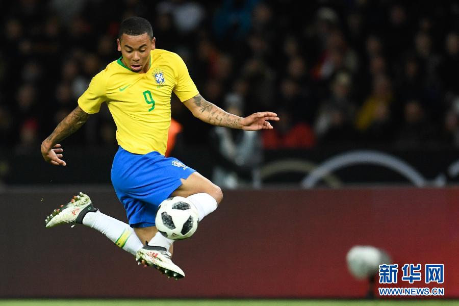 ↑巴西队球员热苏斯凌空停球。新华社照片