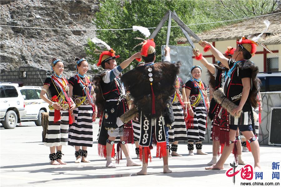 珞巴族原生态歌舞《犀鸟之魂》,图中男子们刀的摆法寓意着屋顶遮风挡雨。中国网记者吴佳潼 摄