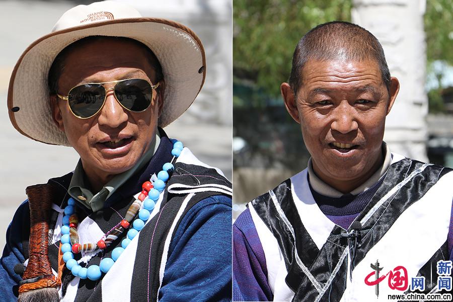 61岁的珞巴族老人猛发(左)和58岁的珞巴族老人达瓦向记者介绍《犀鸟之魂》的创作来源和故事。中国网记者 吴佳潼 摄