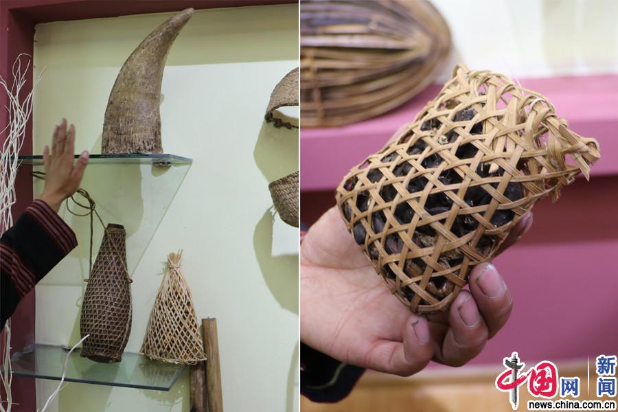 以前,珞巴民族族人游猎用的装水和装酒的器皿(左)以及装螃蟹用的手工编织的“小竹筐”(右)。中国网记者 吴佳潼 摄