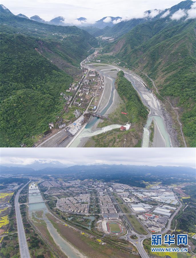 拼版照片上图:俯瞰北川老县城地震遗址(2018年5月11日无人机拍摄);下图:俯瞰北川新县城全景(2018年3月17日无人机拍摄)。新华社记者江宏景 摄