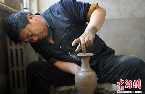 江苏省非物质文化遗产“大丰瓷刻”代表性传承人、江苏省工艺美术行业协会副会长陈银付12日在其展馆里一手握着钢凿,一手握着铁锤,细致耐心地对着桌上的黑色瓷片进行着雕刻,瓷片上的人物用手托着婴儿,嘴角含笑,神态逼真,衣饰纹理清晰,层次感鲜明。