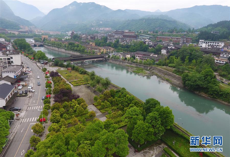 俯瞰四川省汶川县水磨镇风貌(2018年5月5日无人机拍摄)。新华社记者 刘坤 摄