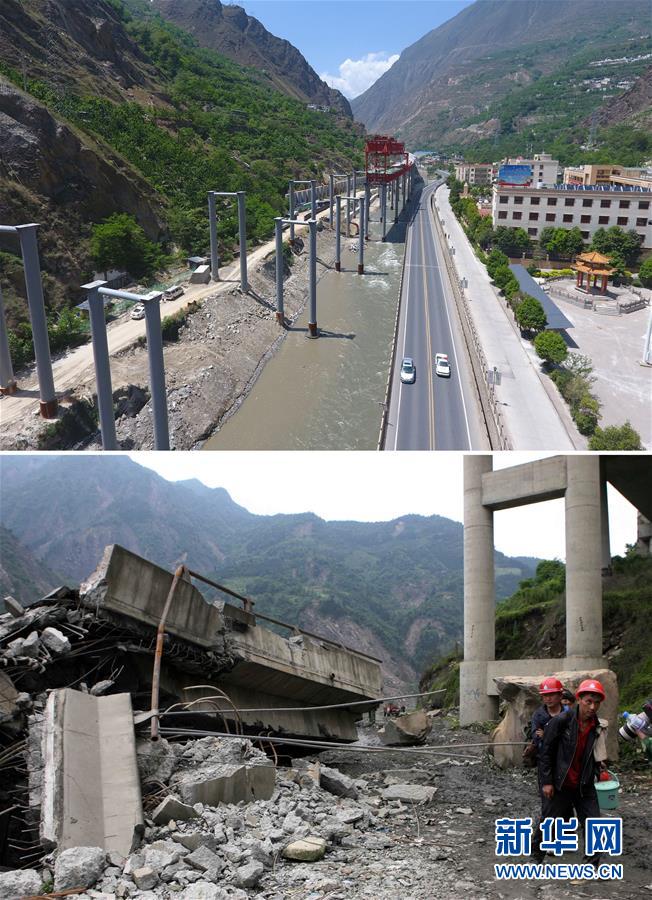 拼版照片:上图为2018年5月7日无人机拍摄的修建中的汶马高速(新华社记者刘坤摄);下图为2008年5月14日,震中地区汶川县附近的道路受到严重破坏,行人从倒塌的大桥旁走过(新华社记者袁满摄)。新华社发