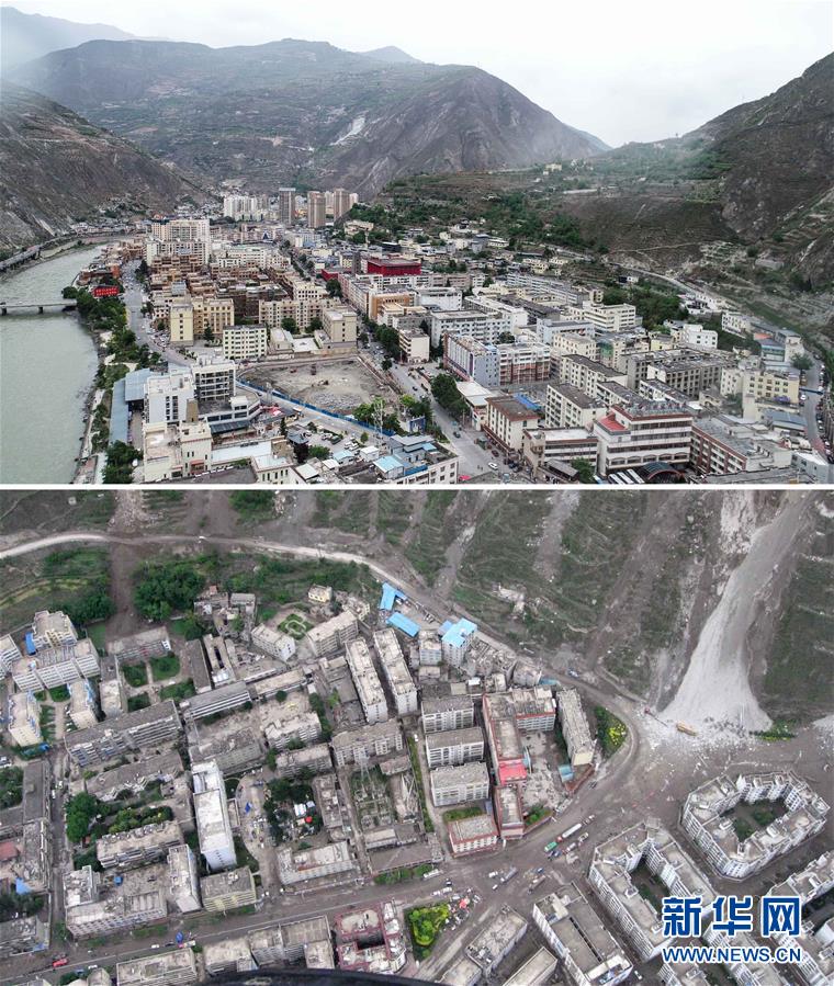 拼版照片:上图为2018年5月1日无人机拍摄的汶川县县城(新华社记者薛玉斌摄);下图为2008年5月14日拍摄的地震后的汶川县县城(新华社记者徐壮志摄)。新华社发