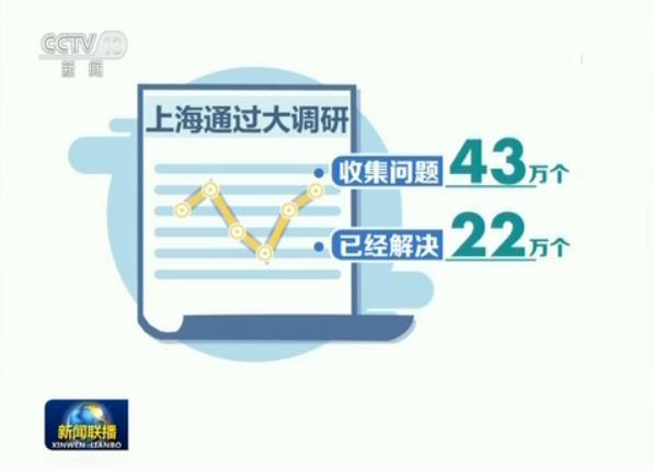 目前,上海通过大调研收集到的43万个问题,已经解决22万个,围绕百姓需求,对标国际标准,大调研工作将持续到今年年底。