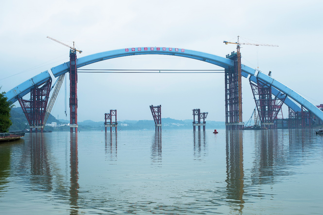 中拱段与边拱段在78米高空实现了完美对接,宛如“一弯新月”挂在了柳江之上