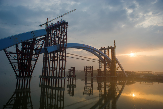 中国日报5月14日电(张怡)钢铁巨龙腾空起,一弯新月挂柳江。5月14日凌晨4点,在具有“桥梁博物馆”之称的广西柳州柳江上,世界第一大有推力钢箱梁拱桥——柳州官塘大桥的5885吨中拱段整体提升到位,标志着大桥建设最大的重难点被成功攻克。据介绍,此次提升还分别创下了整体提升高度、整体提升重量、提升拱肋跨径三项“世界第一”的纪录。