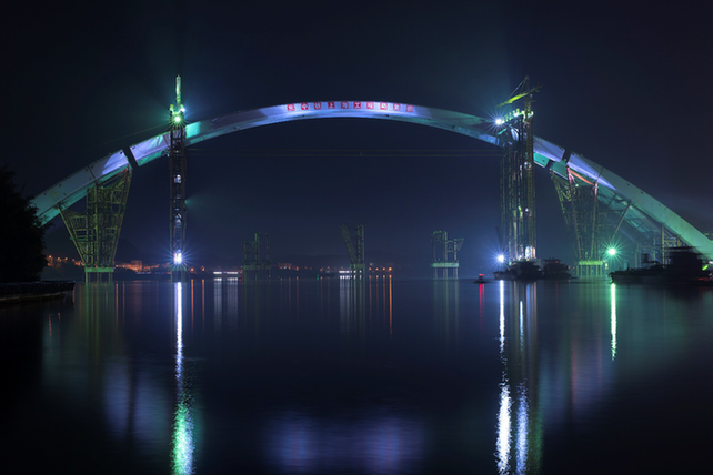 5月6日至14日,在长达9天的紧张而又精细地施工过程中,指挥团队不断根据现场风速、温度、天气条件进行姿态检测和过程调整,最终在14日凌晨4点,中拱段与边拱段在78米高空实现了完美对接,宛如“一弯新月”挂在了柳江之上。至此,大桥建设的最大重难点成功攻克。接下来,项目部计划利用5天时间,将中拱段与两端既有拱肋通过4个小节段进行焊接连接,届时,大桥的钢箱梁主塔将正式合龙。