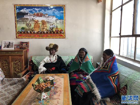 嘎玛次仁(左一)与老伴儿扎西旺姆(左二)、妹妹(右一)在自家客厅里。新华网 雪珍摄