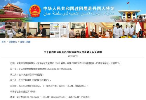 中新网5月15日电据中国驻阿曼苏丹国大使馆网站消息,近期,阿曼苏丹国将中国列入旅游签证受益国家(G1)名单,中国公民可不通过担保人,在线申请旅游签证。