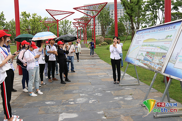 工作人员讲解青山堤防江滩综合整治及临江大道拓宽改造工程。中国青年网记者 刘喆 摄