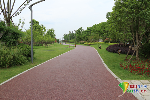 青山江滩堤顶路面采用透水材料铺成,可以做到地表水迅速下渗,路面不存积水。中国青年网记者 刘喆 摄