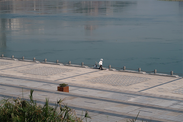图说:长江公园亲水步道上,每隔几十米就有环卫工人清扫地面。黄佳琪摄