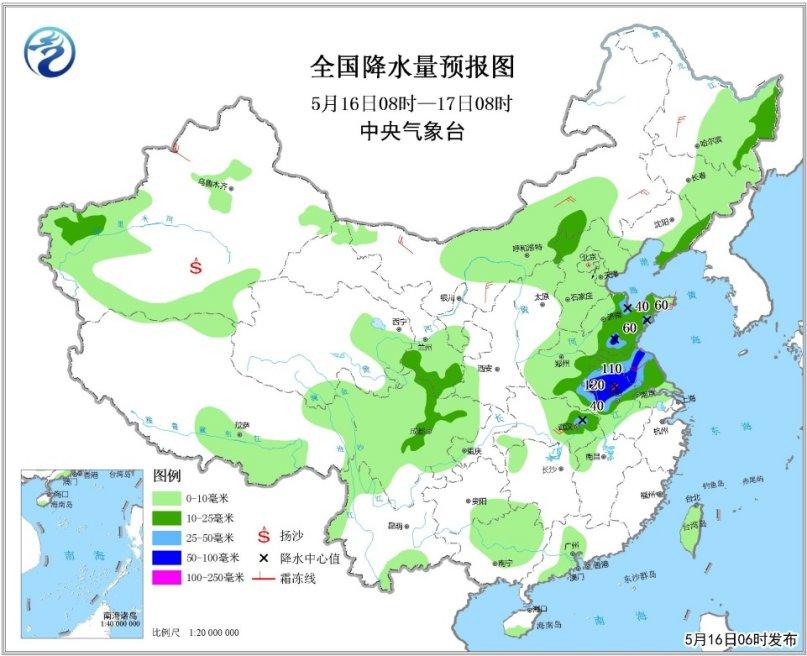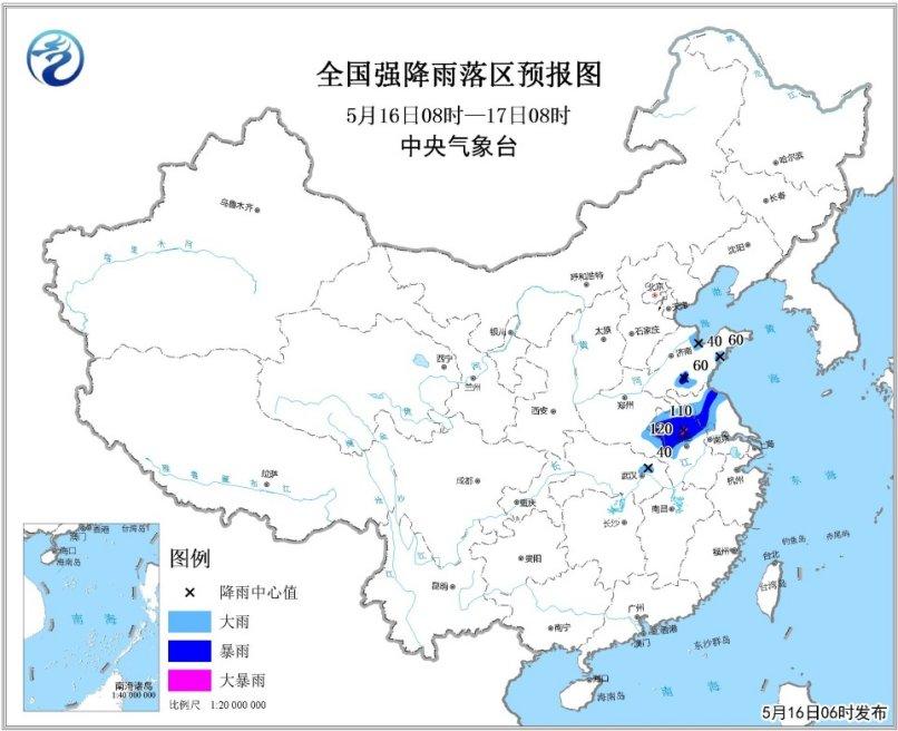 受东移高空槽和西南暖湿气流影响,预计,16日08时至17日08时,山东南部、苏皖北部、河南东部、湖北东北部等地的部分地区有大到暴雨,其中,安徽北部局地有大暴雨(100~120毫米),上述部分地区并伴有雷暴大风、短时强降水等强对流天气。为此,中央气象台5月16日06时继续发布暴雨蓝色预警。