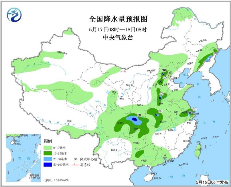 5月17日08时至18日08时,吉林东部、辽宁东北部、山西东部、河北西部、河南北部和西南部、西南地区东部、江汉西部、江南东北部等地的部分地区有中到大雨,其中四川盆地北部局地有暴雨(50~70毫米),上述局部地区将伴有雷暴大风和短时强降水等强对流天气。内蒙古西部、辽东半岛、山东半岛等地有4~6级风。