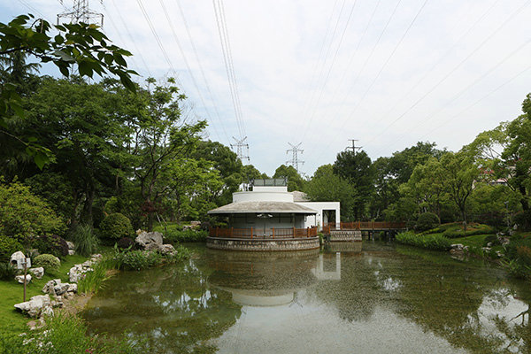 该绿地设计师姚国华介绍,为适应现代城市的发展和风貌,绿地利用现有的河道和水体,通过营造合理的绿化地形,以自然排水为主,选择透水材料进行绿地路面和广场等铺装,结合区域内穿过的张家塘港和漕河泾港,形成“渗、滞、蓄、净、用、排等各类低影响开发雨水设施及其组合系统。