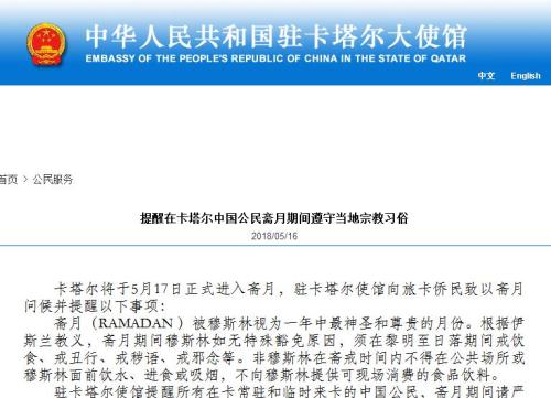 驻卡塔尔使馆提醒所有在卡常驻和临时赴卡的中国公民,斋月期间请严格遵守当地法律法规,尊重当地宗教习俗,切勿于斋戒时间内在公共场合饮水、进食或吸烟。