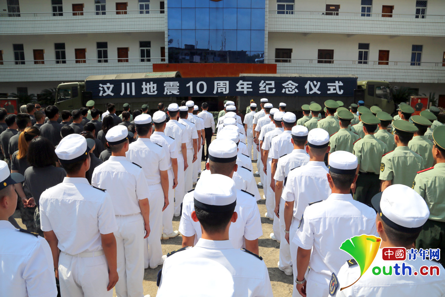 5月12日,参加网络名人进军营活动的网络名人和媒体一行,与驻宁部分官兵一起,举行汶川地震10周年纪念仪式。王云苗 摄