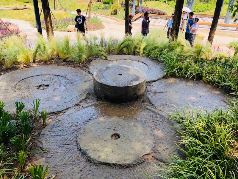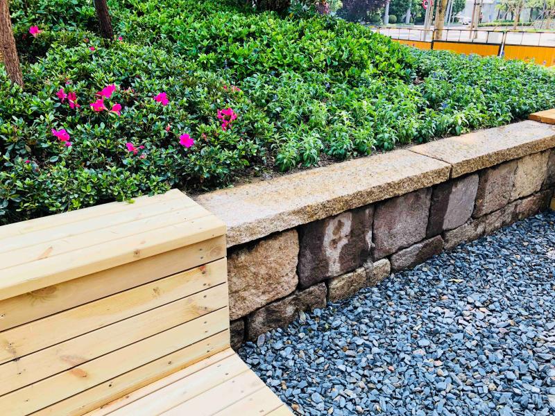 在徐汇中环绿廊内,一些供市民休息的座椅、绿化带围墙也有不少设计巧思融入了“海绵城市”理念。如利将细小的碎石通过垒石的方法稍稍抬高绿化带前的地面,小石子路面不仅比普通水泥地更具亲和力,还具备透水功能。部分绿化带的低矮围墙逐渐向上倾斜,这也并非刻意营造的几何形态,而是尊重中环高压线下地块原有的地形特色,在原来地势基础上加以改进,组成绿地高低起伏的视觉体验。