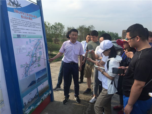 图为马鞍山市港航管理局总工程师江荣向“美丽中国长江行—共舞长江经济带·生态篇”网络主题活动(安徽段)采访团记者讲述马鞍山市长江非法码头专项整治情况