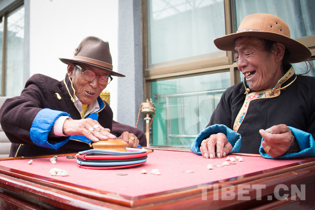 图为错那县五保户供养中心的老人们正在打藏式骰子。
