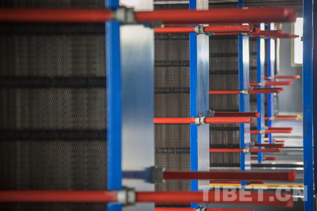 图为供暖机房内的板式热交换器。