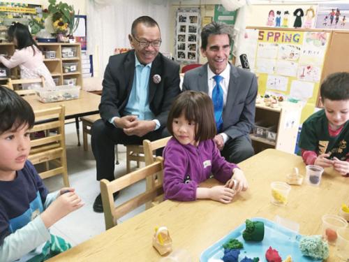 旧金山市长候选人里诺(右)与市议员余鼎昂(左)在了解双语学前教育。(美国《世界日报》记者 李秀兰 摄)