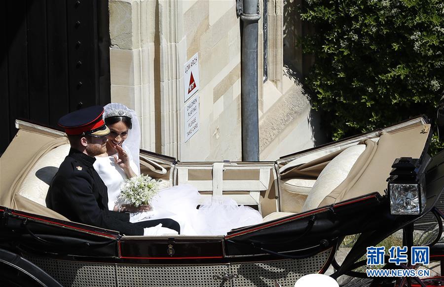 5月19日,在英国温莎的温莎城堡,英国哈里王子(左)与妻子梅根·马克尔在婚礼仪式结束后乘坐马车进行巡游。新华社记者 韩岩摄