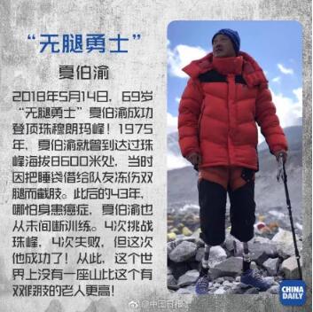 今年五月,他再次对珠峰发起了挑战,终于在5月14日,“无腿勇士”夏伯渝成功登顶珠峰,成为世界登顶珠峰中年龄最大的残障人士。此时,距离他第一次攀登珠峰失去双腿,已经过去了43年。