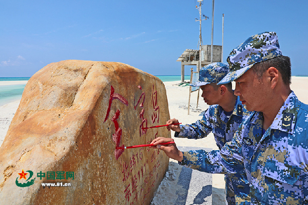 在全富岛,关建军和三沙市副市长陈儒茂带头描摹主权碑上“中国”两个大字。“每描一笔,都感到神圣无比,建设强大稳固的现代边海空防,共同守护好我们的祖宗海,离不开军地协力。扛起这一如山使命,我们责无旁贷!”关建军的话语掷地有声。(薛成清、盆世舟、潘新新)