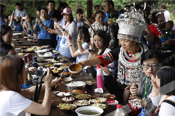 “阿哥阿妹坐拢来,满堂挂满红灯笼,倒碗腊肉倒碗酒,苗家姑娘乐开怀……”,刚到九黎城,只见热情的苗族阿哥阿妹身着盛装,唱起欢快的《敬酒歌》,在长廊里摆上特色长桌宴,迎接远道而来的客人。