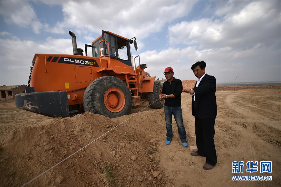 在宁夏盐池县曾记畔村,朱玉国(右)在工地查看村饲料加工厂的建设情况。