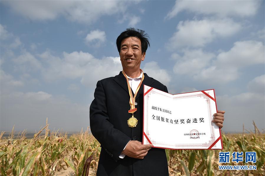 在宁夏盐池县曾记畔村,朱玉国展示他获得的奖项。
